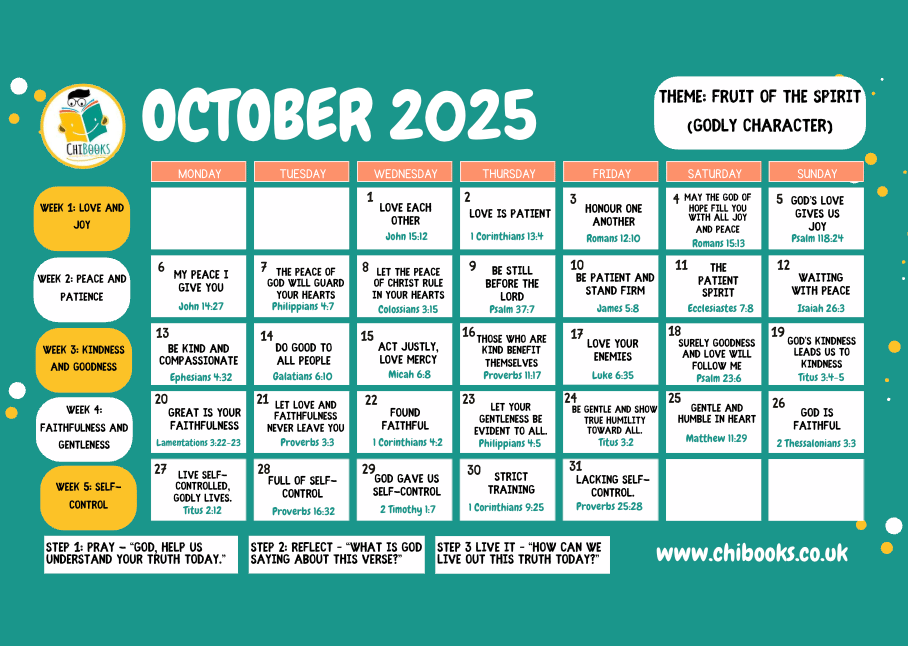 Help children grow in faith with this October 2025 Devotional Calendar, designed around the Fruit of the Spirit (Galatians 5:22-23). Perfect for use at home, in school, or for children’s ministry, this printable PDF gives children daily Bible verses and reflection prompts to help them live out love, joy, peace, patience, and more in their everyday lives.